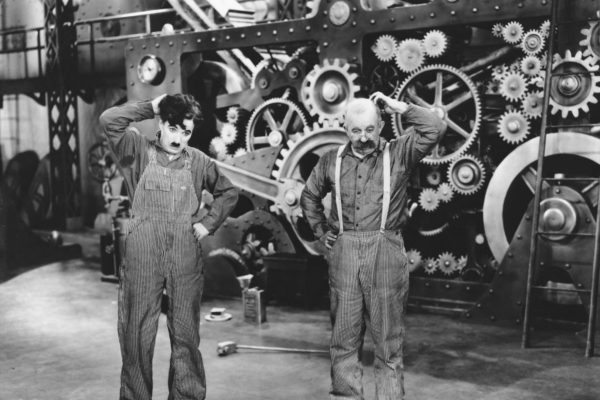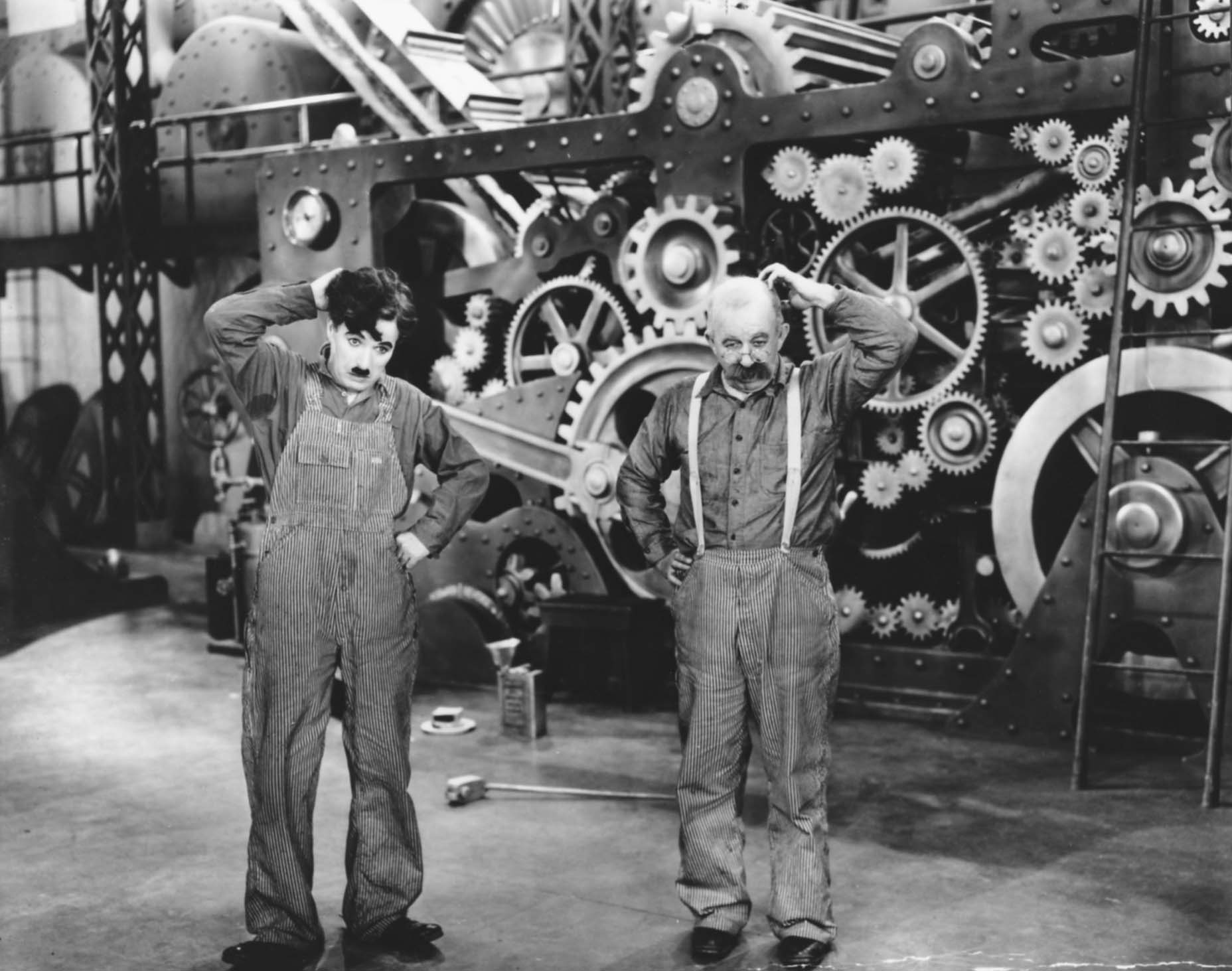 Charlot est ouvrier dans une gigantesque usine. Il resserre quotidiennement des boulons. Mais les machines, le travail à la chaîne le rendent malade, il abandonne son poste, recueille une orpheline et vit d’expédients. Le vagabond et la jeune fille vont s’allier pour affronter ensemble les difficultés de la vie…